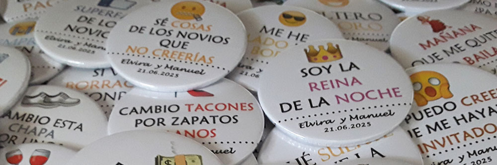 Chapas personalizadas con impresión digital a todo color. Si necesitas chapas para tu boda, para una despedida de soltera, un detalle publicitario para tu empresa o cualquier otro evento, puedes contactar con nosotros por mail en info@presumede.com, por teléfono o Whatsapp en el 652 785 774 o a través de nuestro Formulario de contacto.